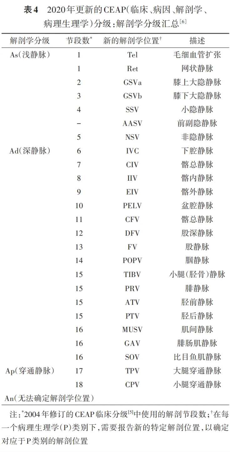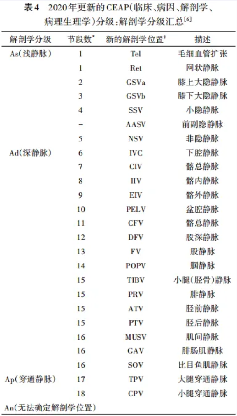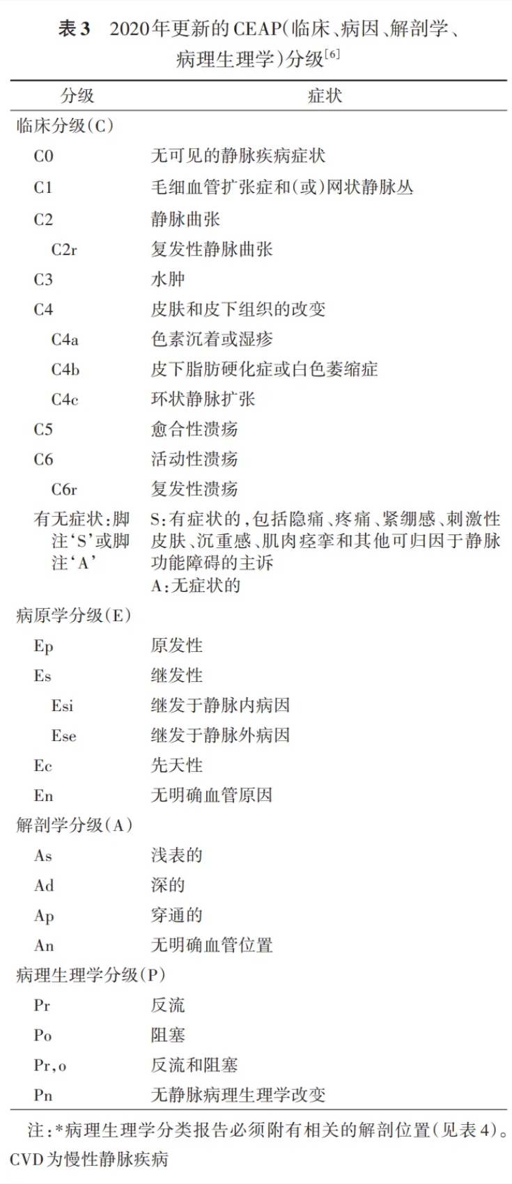 CEAP分级可以详细记录特定时间点的疾病状态,包括临床症状、病因、解剖和病理生理(见表3)。最新的CEAP临床分级于2020年发布,新增了分类如环状静脉扩张(C4c)、复发性静脉曲张(C2r)以及复发性下肢溃疡(C6r),并将继发性病因进一步细分为静脉内(Esi)和静脉外(Ese),同时引入了新的解剖术语缩写,以取代先前使用的数字描述(见表4)[6]。