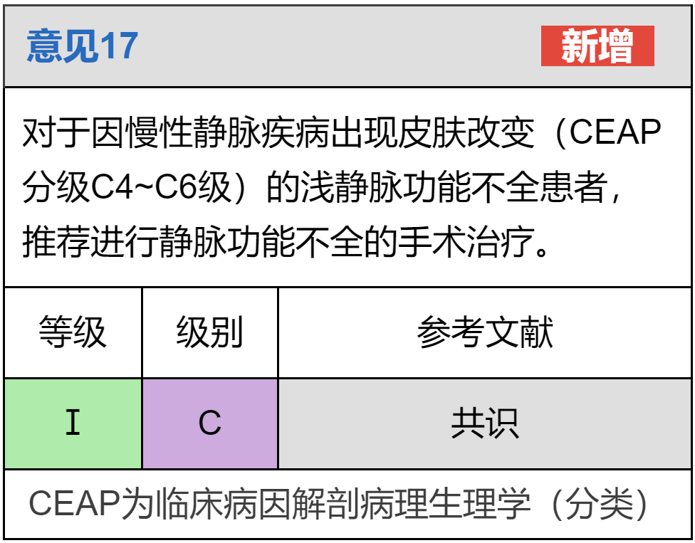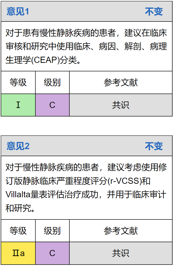 在考虑CVD的计分系统时,重要的是要意识到CEAP分类只是在某一时间点对患有CVD的肢体进行描述,允许将其分组为CVD分组。虽然CEAP类别的变化提供了有用的信息,可能指导管理,但CEAP分类是范畴的,因此不适合监测治疗成功、评估疾病进展或合理分配干预措施。提供连续变量的计分工具更适合这一目的。