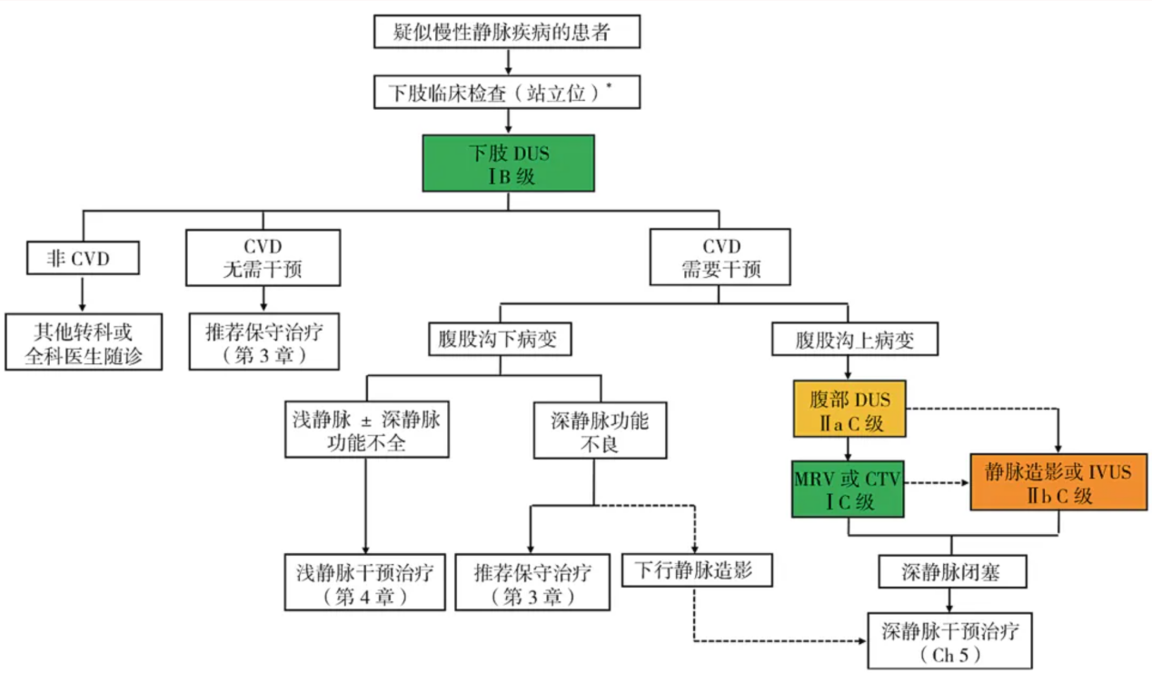 主要的诊断路径总结如图5所示。所有因下肢慢性静脉疾病怀疑而就诊的患者,在病史和临床检查基础上,应常规进行全腿DUS检查。如果根据临床检查或特定的DUS发现(见第2.3.2节)怀疑存在腹沟以上病理学,下一步应进行额外的腹部和盆腔DUS检查。在考虑进行干预治疗时,评估从腘静脉主干(DFV)到总股静脉(CFV)的流入情况可能是合适的。