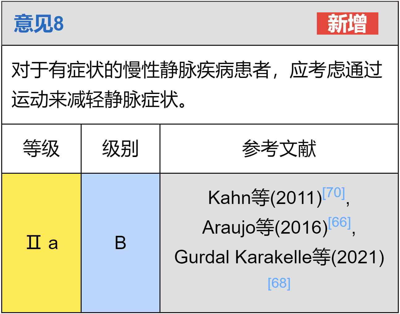 随之而来的可能是减少腿部水肿,预防或改善由CVD引起的皮肤变化。它也可能缓解PTS的症状和体征,尽管现有的证据很少[70]。尽管缺乏针对慢性静脉病(CVI)的具体研究,但运动对静脉功能有益的间接证据是相当充分的,因此应该得到推广[67]。