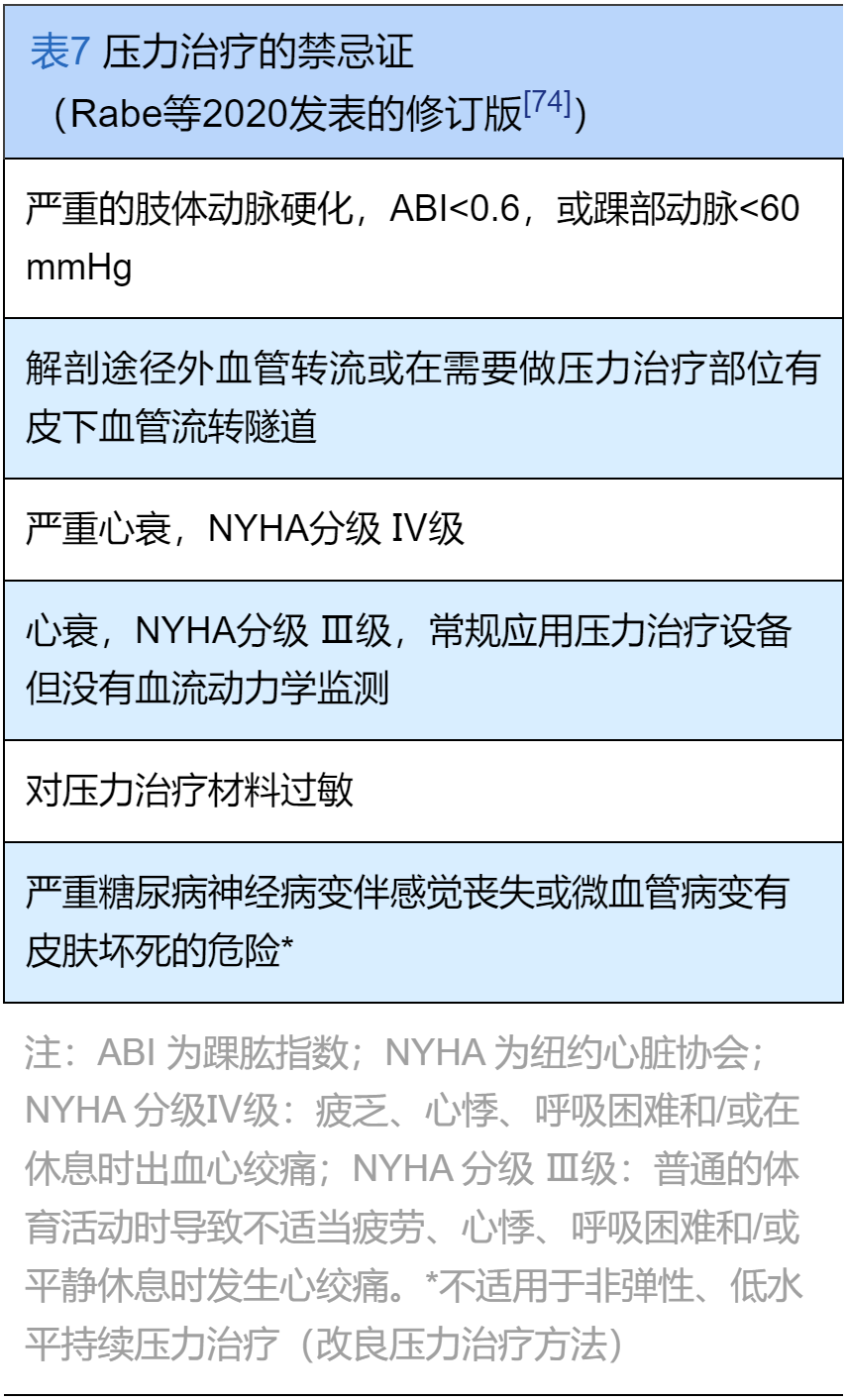 在为CVD管理配备压缩装置时,有必要通过测量踝部的绝对压力值和ABI来检查潜在的下肢动脉硬化性疾病。对于糖尿病患者,还需进行额外的趾压力测量,因为由于动脉中层动脉硬化,ABI可能不可靠。在存在动脉功能障碍或严重神经病变的情况下,必须降低压缩压力[74]。这在具有混合动脉和静脉溃疡的患者中尤为重要(见第6.3.3小节)。