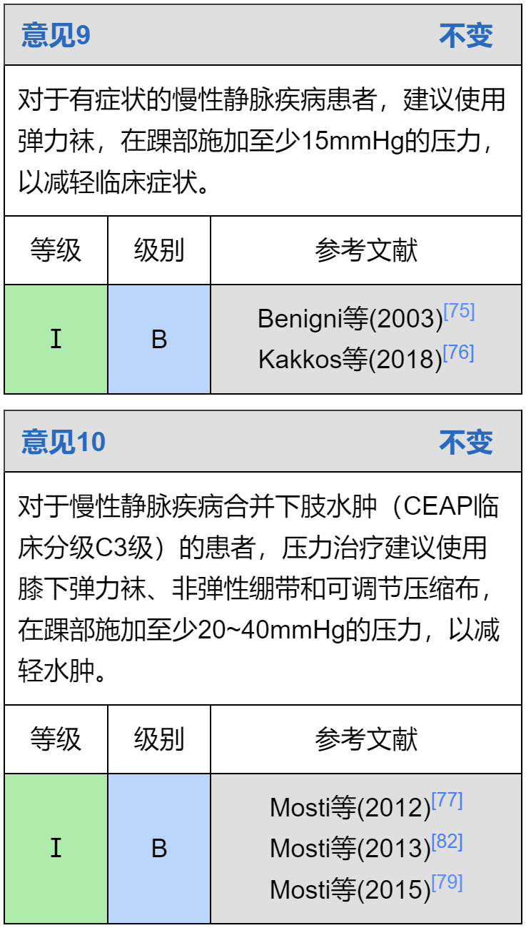 通过施加踝部压力为15至32mmHg的逐渐增加ECS的压缩疗法已被证明在减轻与CVD相关的疼痛、沉重感、抽筋和水肿方面对C1s至C3s CEAP临床分级的患者有效[75,76]。
