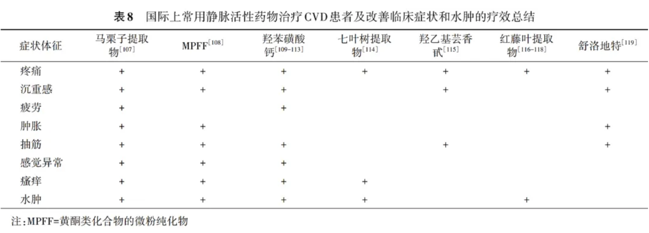 沉重感、肿胀感、灼热感、瘙痒感和疼痛/酸痛等症状与CEAP临床类别的高C级别在症状的强度和数量上均有关联。疲劳、抽筋和不安腿等症状对CVD的特异性较低[30,31]。