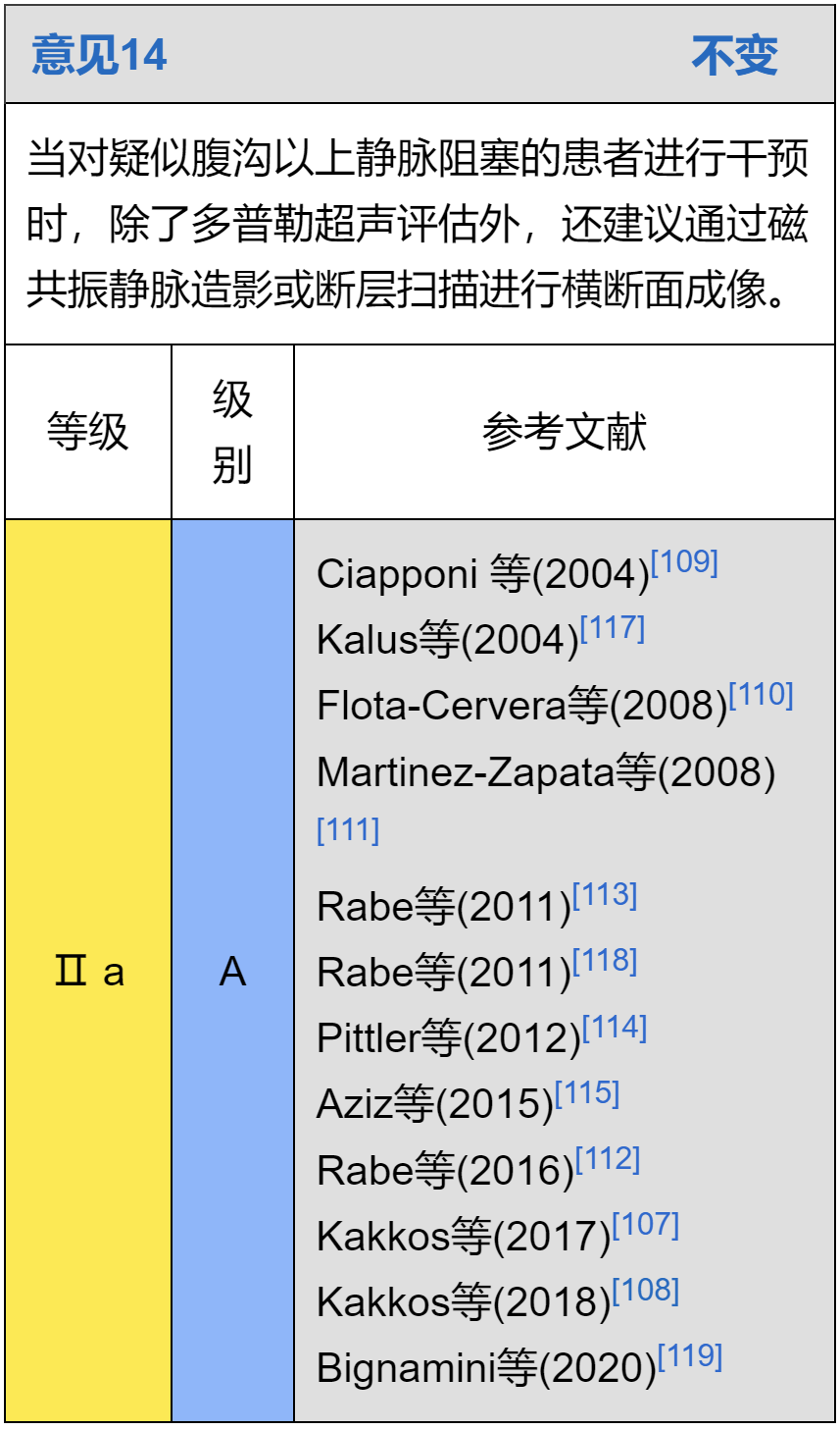 怀疑存在腹沟以上静脉梗阻的进一步评估,可以通过腹部DUS或直接使用横断面成像进行,其中最常见的是MRV或CTV[51,53,56]。 在选定的患者中,如果横断面成像不足或不可用,可以计划进行静脉造影和/或IVUS检查。