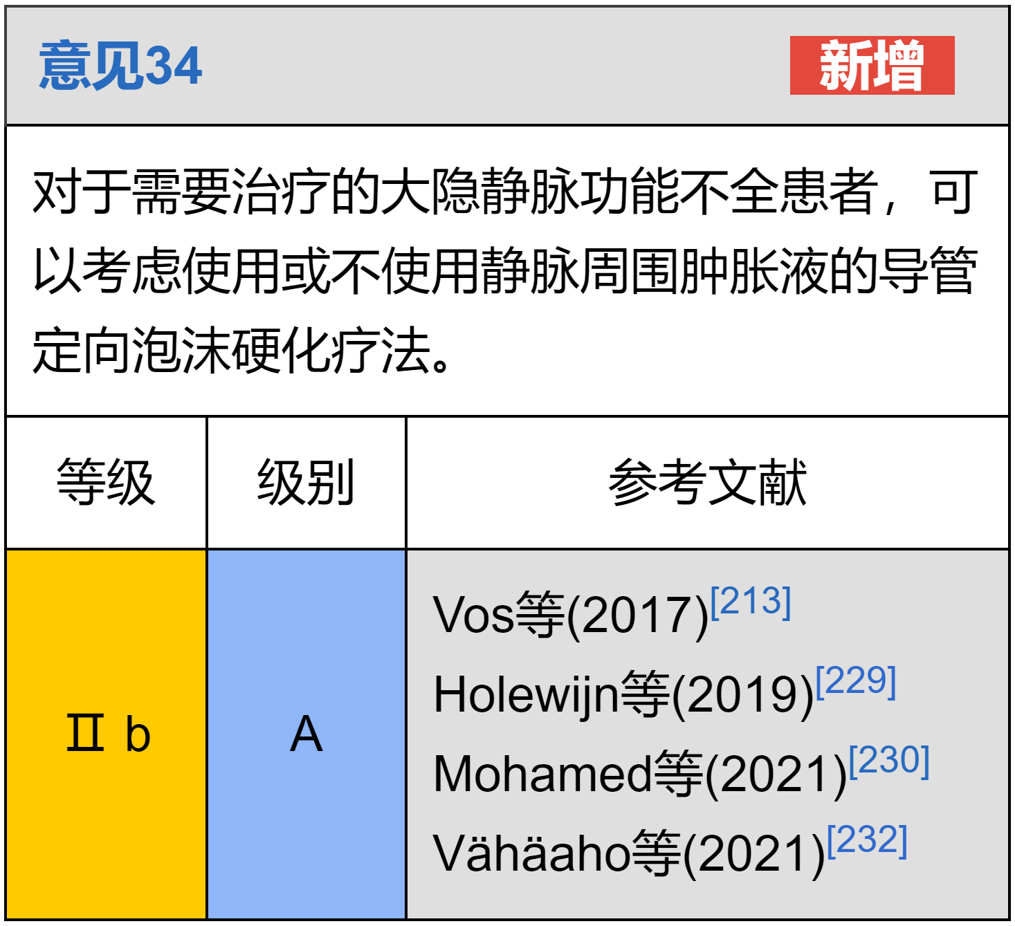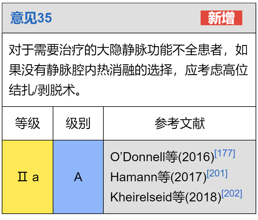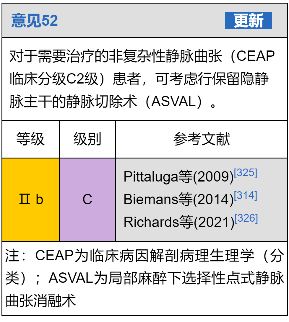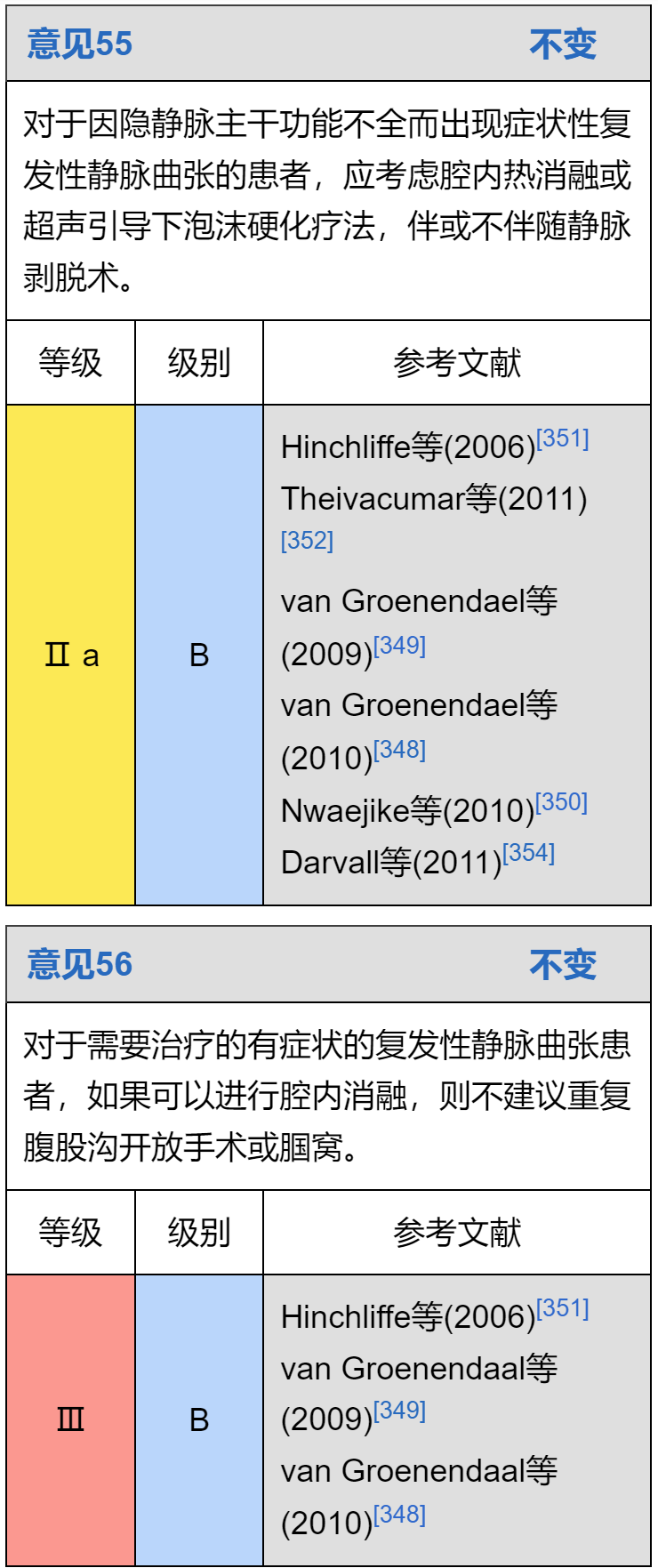 几项研究描述了在复发性静脉曲张治疗中,特别是在存在复发或残余的功能不全隐静脉干的情况下,EVTA作为一种安全有效的选择。[348--352] 一项小规模随机对照试验将重复手术与RFA进行了比较,发现后者在疼痛评分、瘀伤和操作时间方面更优[351]。在两项回顾性研究中,比较了GSV和SSV的EVLA与开放式重复手术,EVLA组的再复发和并发症率较低[348,349]。尤其是在EVLA后,腓神经痛比SSV重复手术后少见(9%vs.20%)[348]。