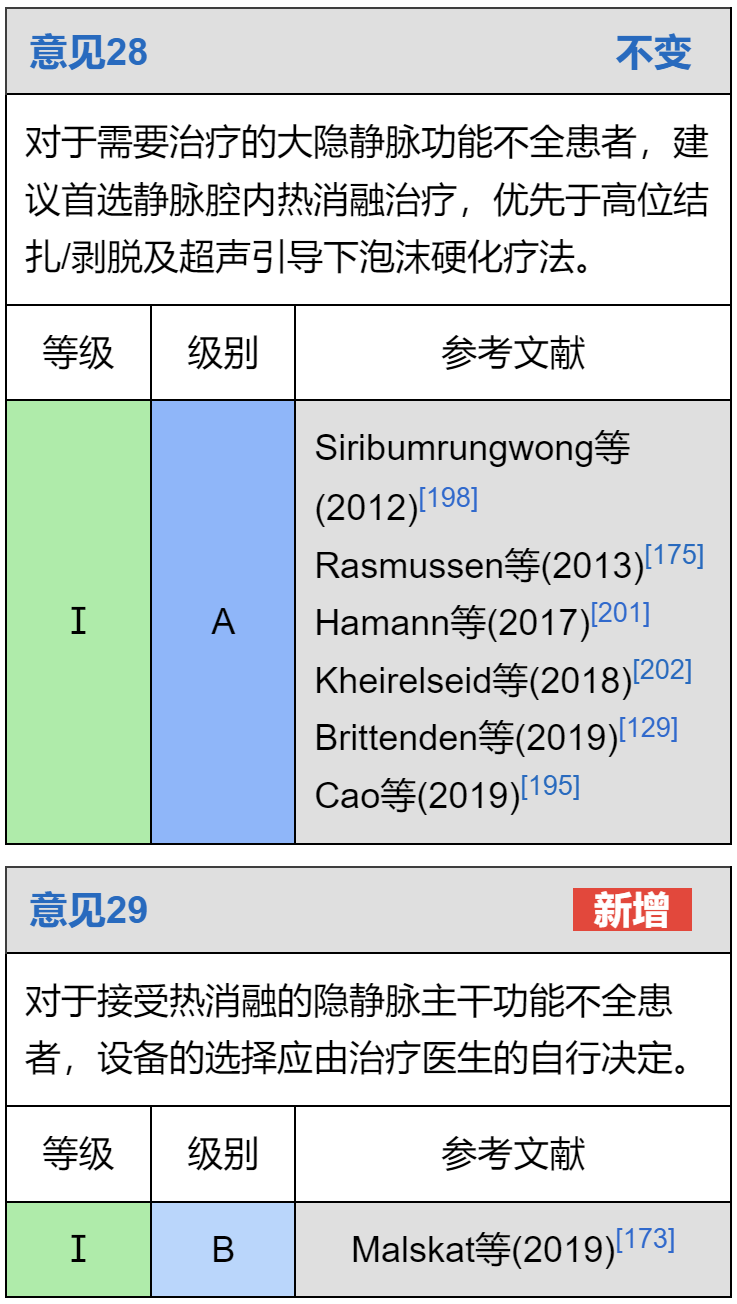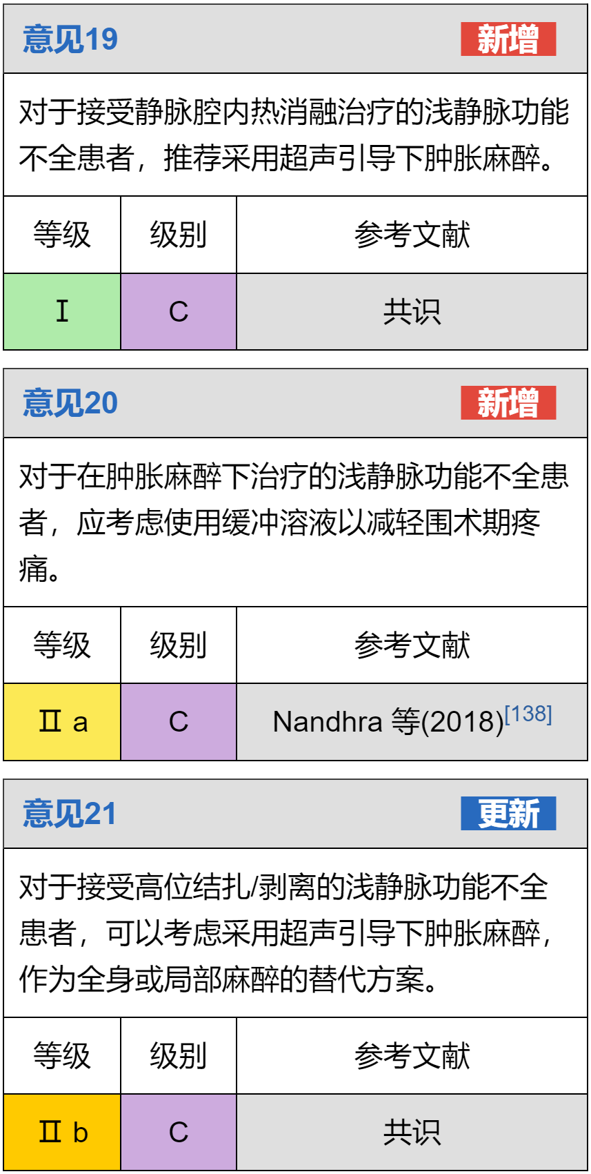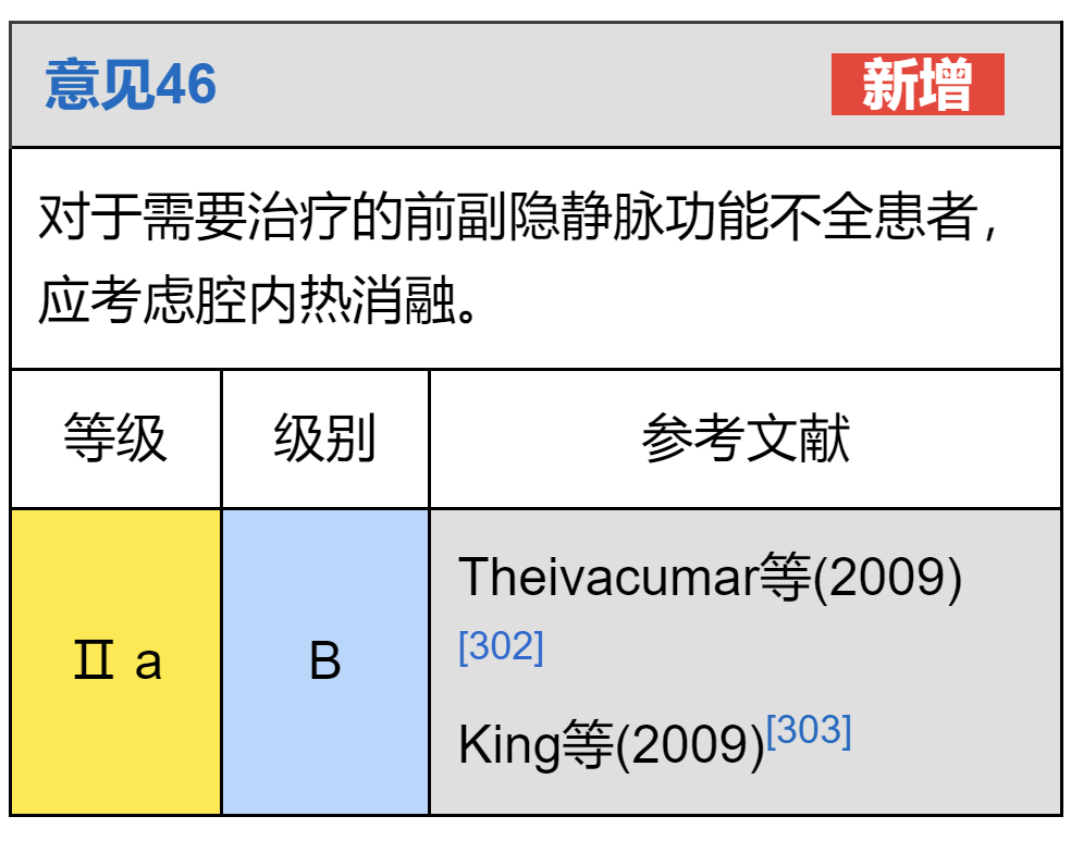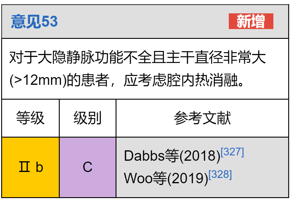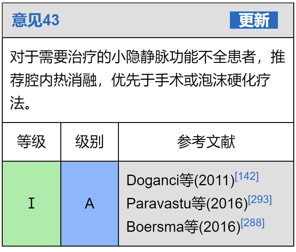 几项研究描述了在复发性静脉曲张治疗中,特别是在存在复发或残余的功能不全隐静脉干的情况下,EVTA作为一种安全有效的选择。[348--352] 一项小规模随机对照试验将重复手术与RFA进行了比较,发现后者在疼痛评分、瘀伤和操作时间方面更优[351]。在两项回顾性研究中,比较了GSV和SSV的EVLA与开放式重复手术,EVLA组的再复发和并发症率较低[348,349]。尤其是在EVLA后,腓神经痛比SSV重复手术后少见(9%vs.20%)[348]。