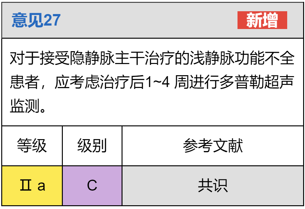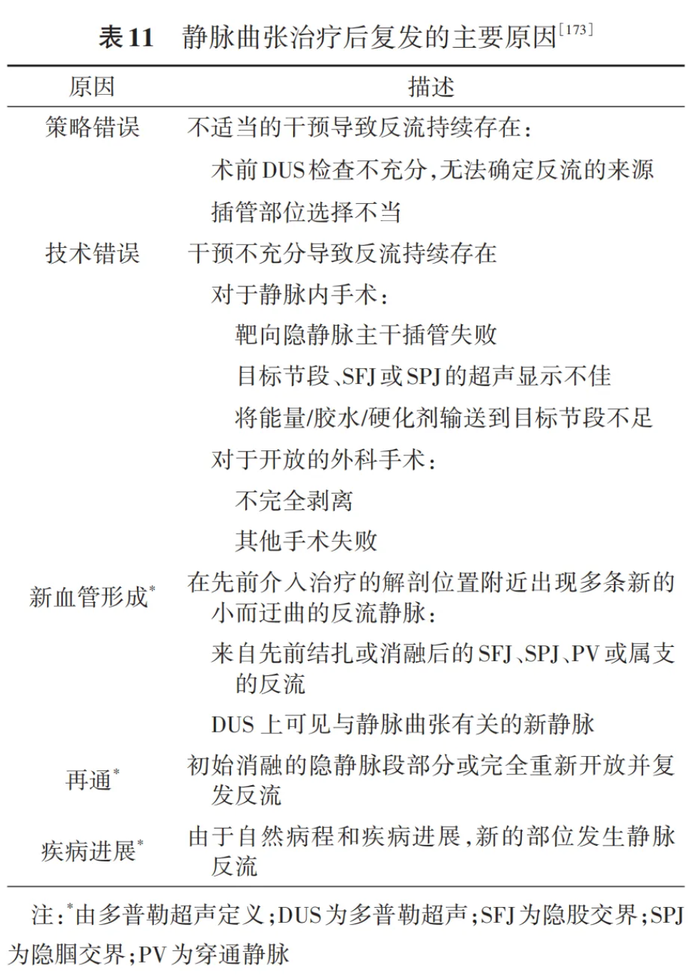 复发性VVs通常表现为先前接受过腔内静脉消融治疗的静脉干的再通和先前手术部位的新生血管化(特别是在SFJ处),或其他静脉如AASV、SSV或PV的反流,这些静脉可能先前是健康的。调查的目的是识别复发的性质和来源[16]。