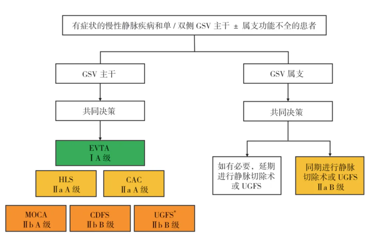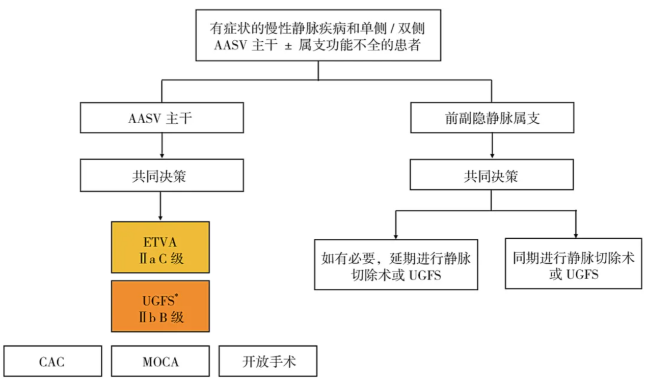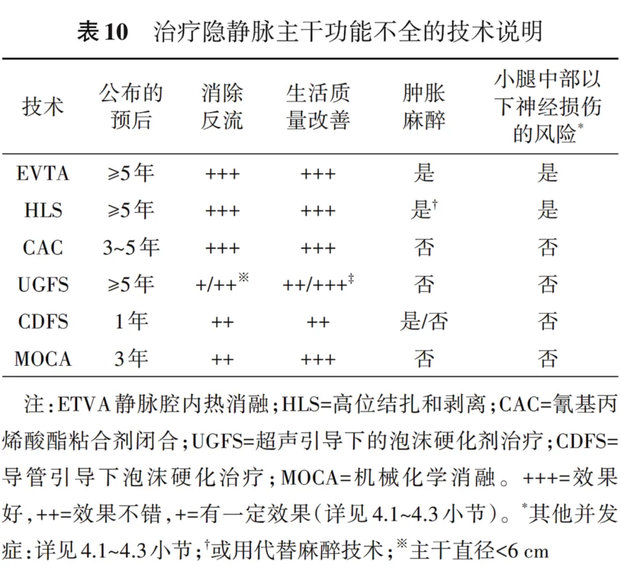 在提供EVTA时,严密的超声引导是减少复发的必要条件,类似于其他技术。GSV的消融长度应由最低的反流支流确定,消融长度不足会导致重新干预的比例增加[345]。然而,在少数情况下,小腿部位的GSV消融可能会导致隐静脉神经损伤,这种风险必须在疾病严重性的背景下仔细考虑。在这些情况下,辅助的膝下UGFS与膝上热消融可能会减少这种风险[345]。