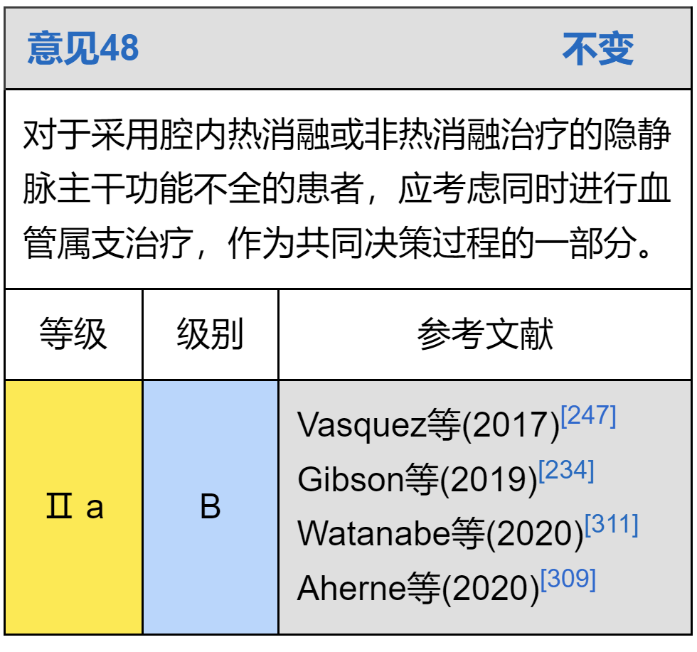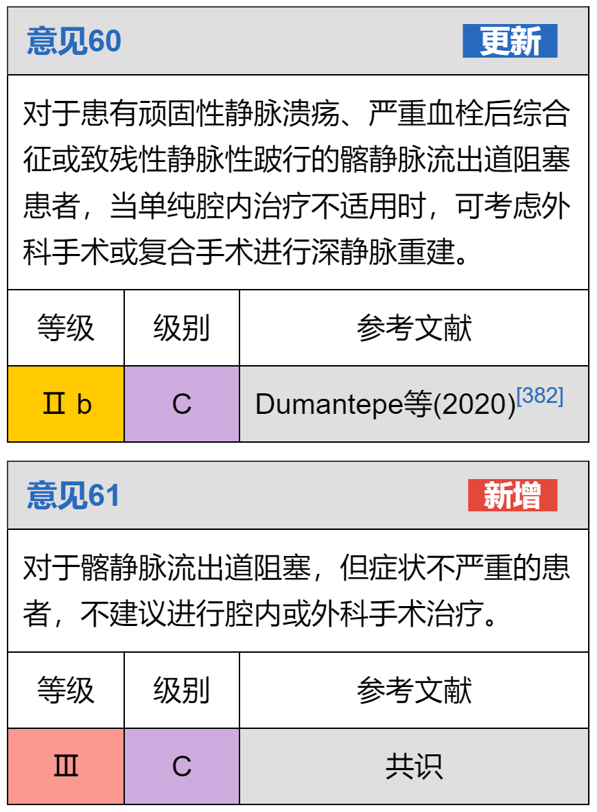 总体而言,目前缺乏强有力的证据支持外科重建的益处。它应该被视为特殊情况下的选择,如没有其他治疗选择的重大疾病,特别是患有C4至C6疾病、严重PTS和/或每日活动受限的患者。经腔内技术应该是首选的治疗选项。