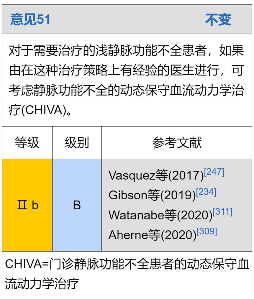 Cochrane回顾在主要瓣膜功能不全患者中鉴定了四项随机对照试验,比较了带浅静脉手术的瓣形成术与不带浅静脉手术的瓣形成术[394]。鉴于这些试验质量较差,无法得出结论。目前尚无包括具有血栓后瓣膜功能不全患者的试验。总体而言,开放式瓣膜重建术后DVI的无溃疡率在五年内变化在54%至100%之间,但这也可能归因于部分患者进行的浅静脉回流或压缩疗法治疗。由于尚未进行比较研究,无法对选择不同类型的DVI手术做出任何推荐。