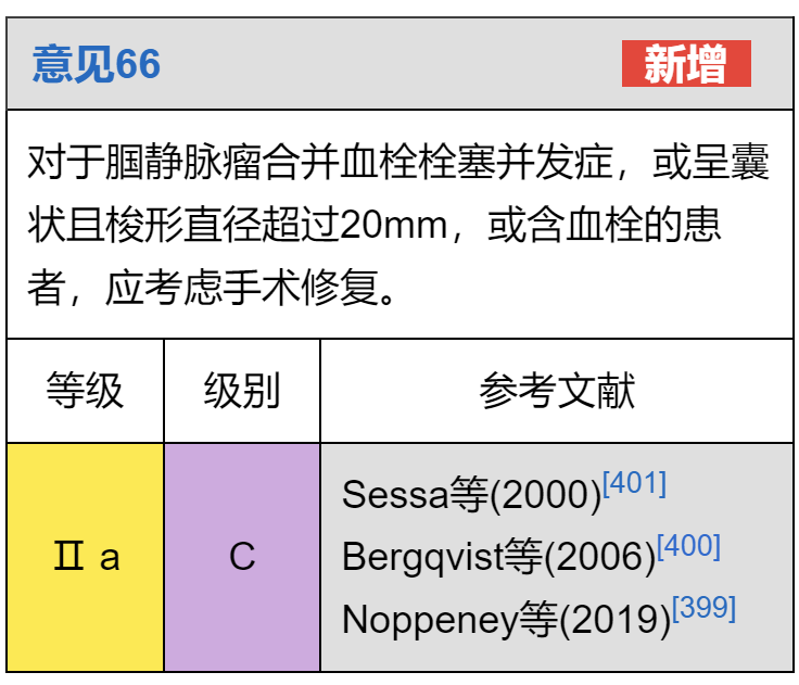 腘静脉瘤可能无症状,或仅因质量效应而引起局部不适。然而,如果发生血栓形成,它们还可能引起深静脉血栓形成(DVT)和肺栓塞(PE)[400]。年龄较大、静脉瘤直径大于20毫米以及静脉瘤内湍流流动的存在被发现会增加DVT和PE的风险[399]。
