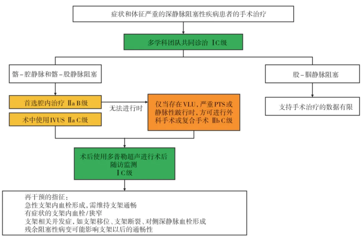 强烈建议对于接受髂静脉阻塞干预的患者,特别是那些伴有PTS的患者,应在多学科团队中进行管理。该团队主要包括介入放射科医生、血管外科医生和血液学家(对血栓形成具有特别兴趣)。根据需要,可以向团队添加其他专科医生。