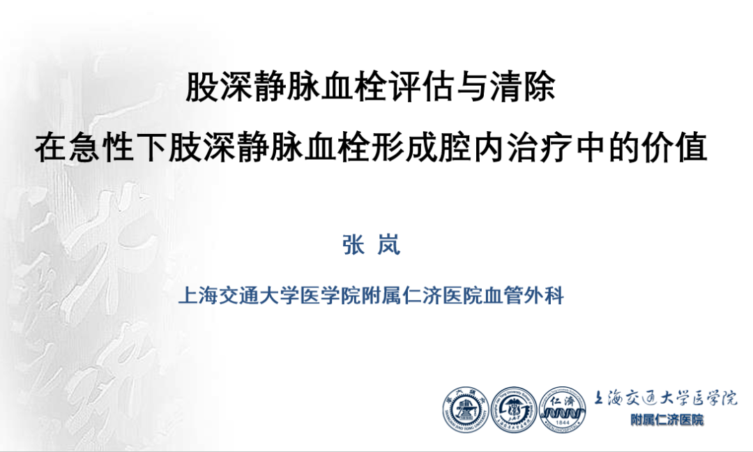 本次大会期间,上海交通大学医学院附属仁济医院张岚教授为各位专家同道介绍了《股深静脉血栓评估与清除在急性下肢深静脉血栓形成腔内治疗中的价值》。欢迎阅读。