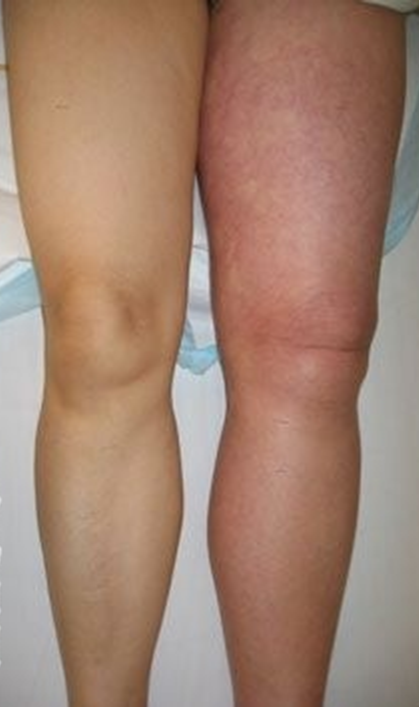 单侧水肿、皮肤发红