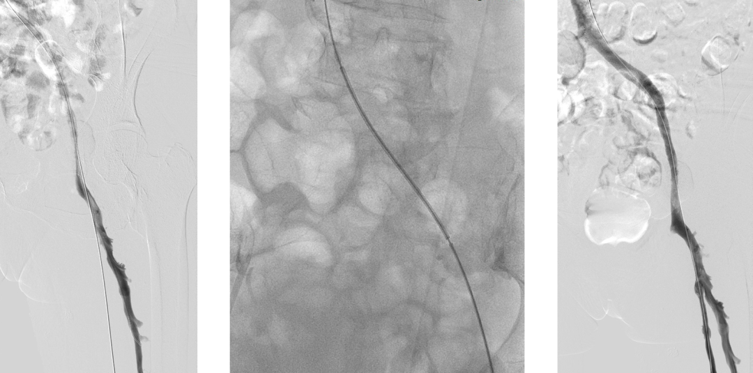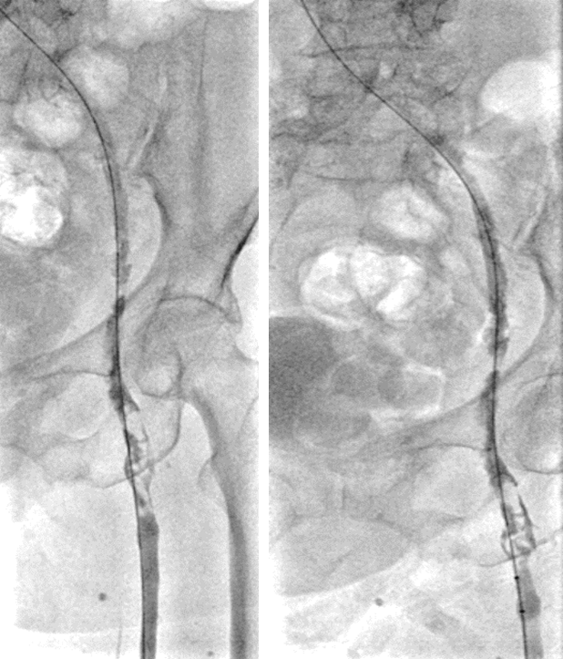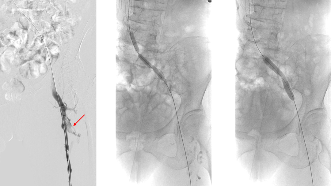 复查造影:股深静脉内血栓,股总静脉血流瘀滞,左髂静脉狭窄行PTA