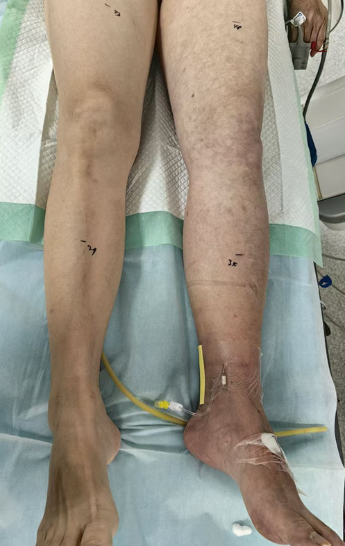 查体:左下肢肿胀明显,大腿周径较对侧粗5cm,小腿周径较对侧粗5cm