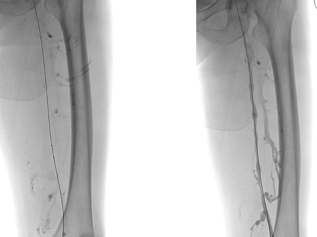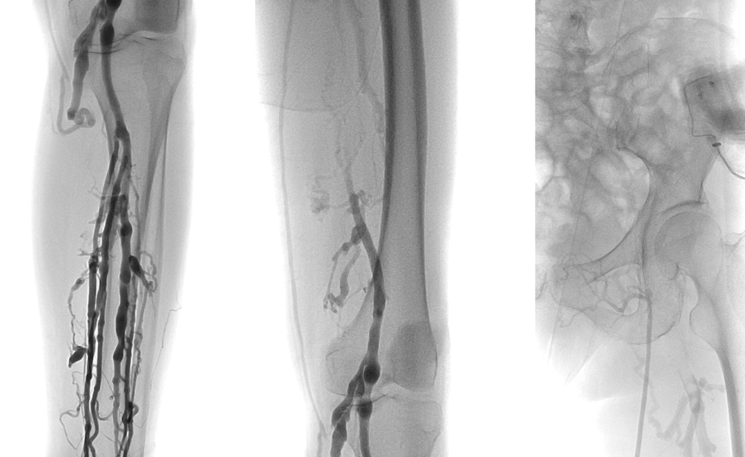 左足背静脉造影:左小腿深静脉、腘静脉通畅,股浅静脉、股总静脉及髂静脉血栓