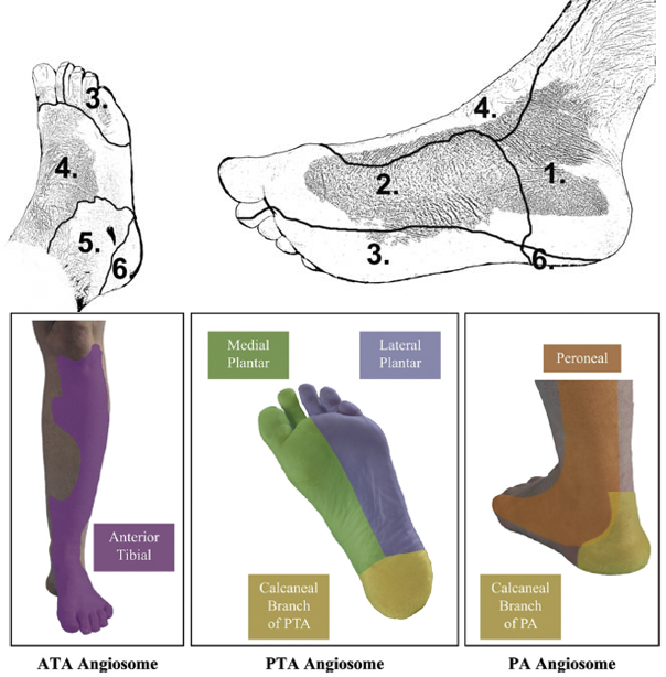 Angiosome是一个解剖学概念,由Taylor和Palmer于1987年首次提出,建立在正常人尸体解剖基础上。该概念将足踝部分为"三支六区":