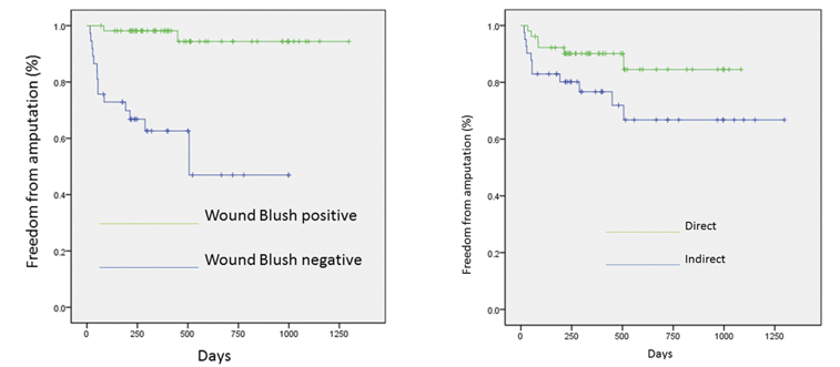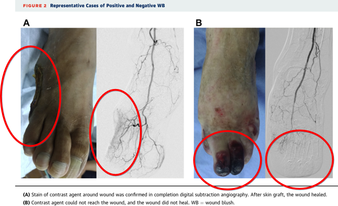 2012年,Makoto等人提出足部"创面染色"作为膝下动脉腔内治疗的评价标准。研究显示,获得足部创面良好染色的患者3年保肢率显著提高(96.4% vs 56.8%)。
