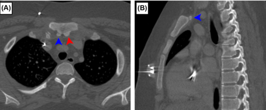 此外,胸骨的正常变异也不容忽视。上胸骨小骨 是一种存在于约1.5%人群中的正常变异,在亚洲人群中发生率更高(约3.8%)。如图A(轴位视图)和图B(矢状位视图)所示,这些小骨位于胸骨柄后方,可能与胸骨柄完全分离,进一步增加了左头臂静脉前方受压的风险。