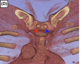 图D:左侧头臂静脉周围骨骼与软组织关系示意图(黄色:骨骼结构;红色:软组织)