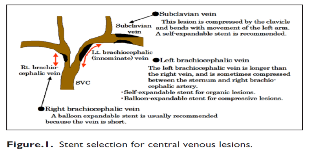 对于静脉分叉口(如头臂静脉汇入上腔静脉处)的病变,支架近端的斜面设计 比平头设计更符合解剖生理,能减少对血流的影响和对对侧静脉开口的干扰。对于长度超过2cm的病变,可能需要特殊形态的支架来确保完全覆盖且不影响重要侧支。