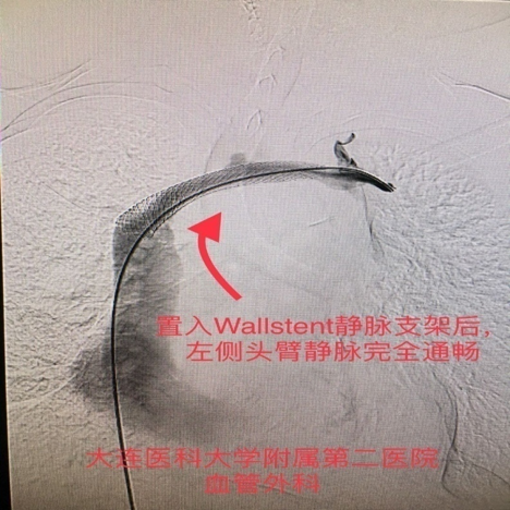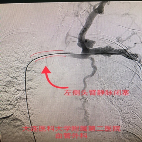 手术过程:造影证实为左侧头臂静脉闭塞。经球囊扩张成形术后,症状完全缓解,内瘘恢复正常使用。