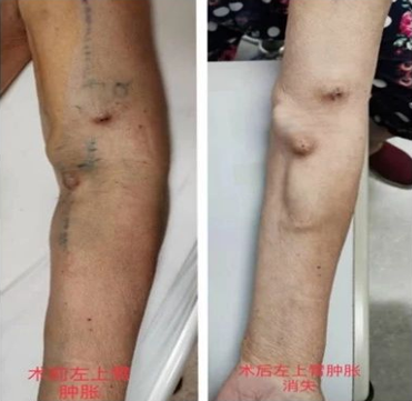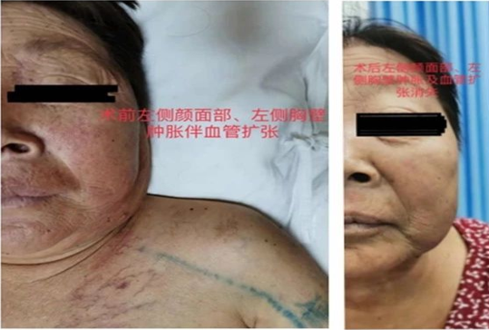 术后:术后患者左上臂、左侧颜面部消肿,左侧胸壁曲张静脉消失,左侧动静脉内瘘正常使用。