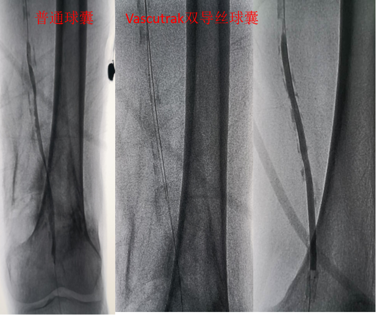 图:普通球囊管腔准备,弹性回缩明显,加用双导丝球囊