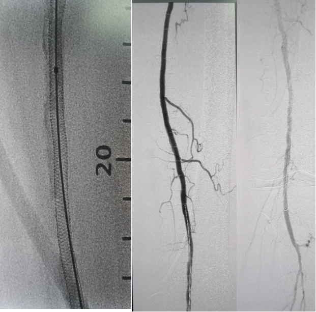 图:双导丝球囊低压扩张,后置入支架,术后造影血流满意