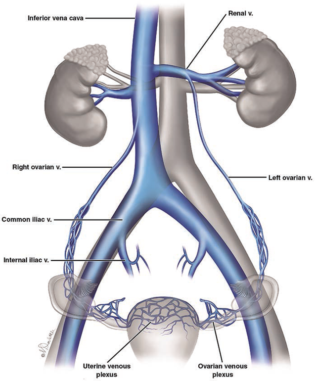 associated with primary reflux in the ovarian/internal iliac veins or obstruction of the left renal or common iliac veins);