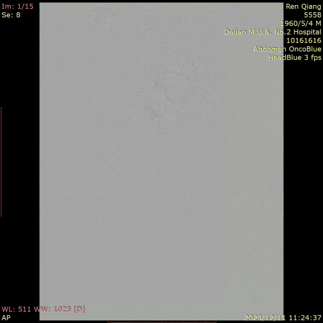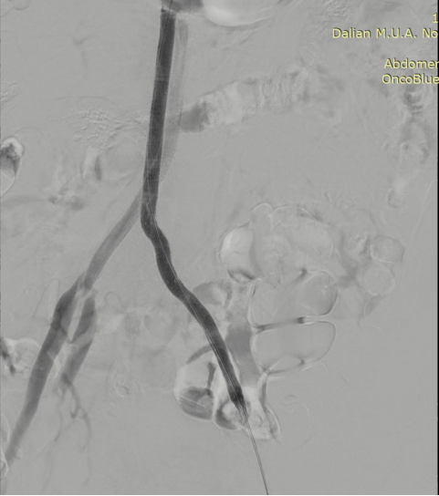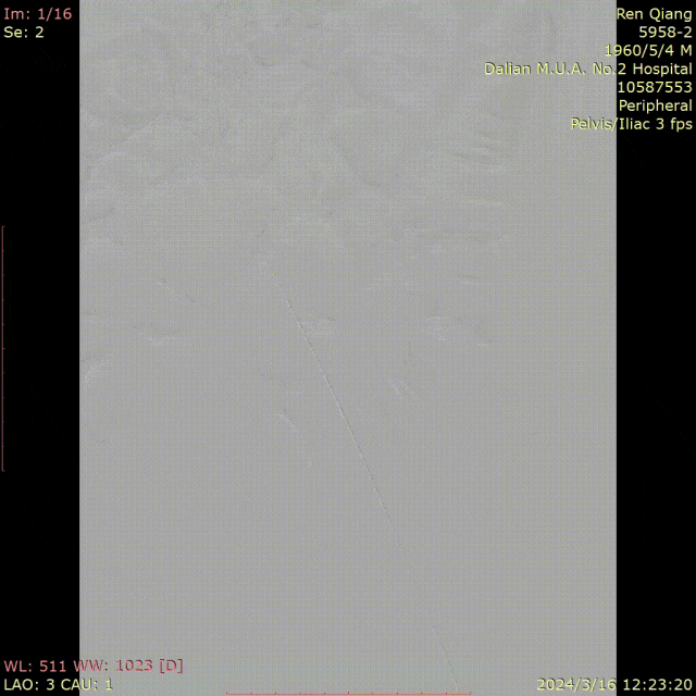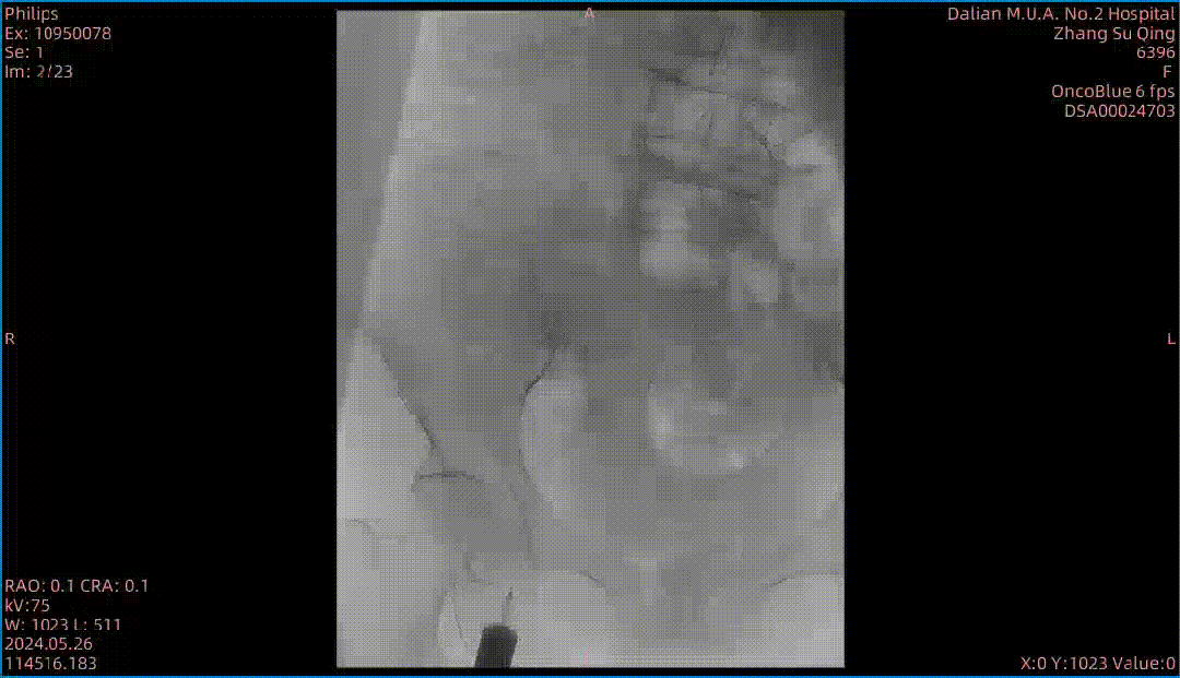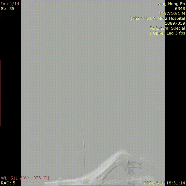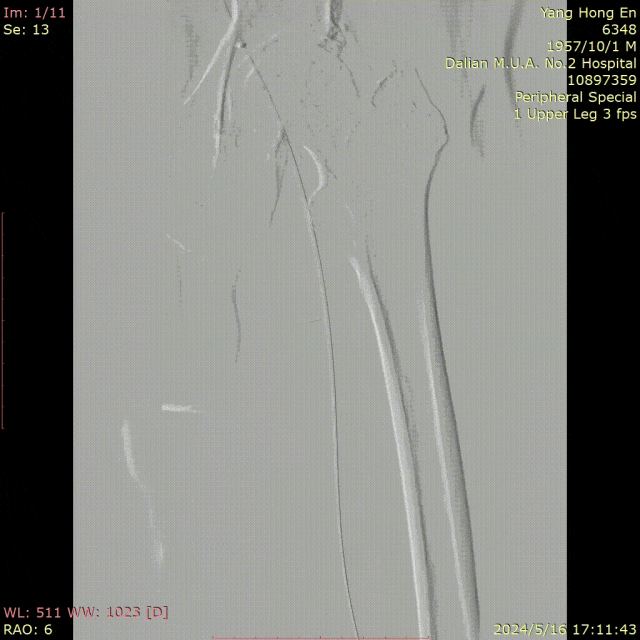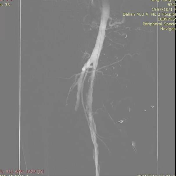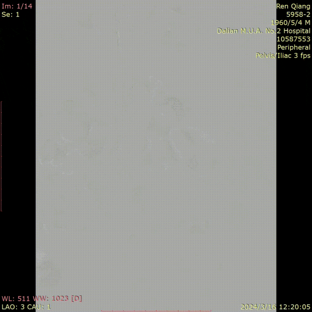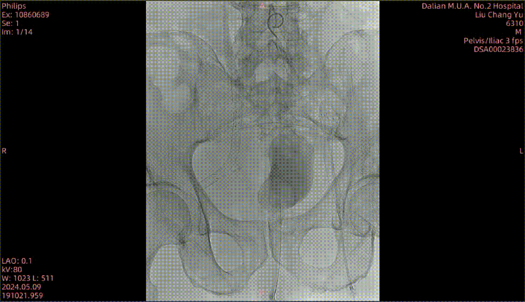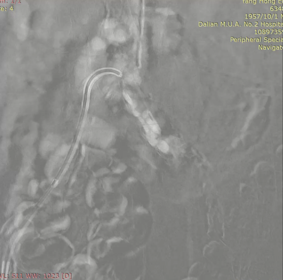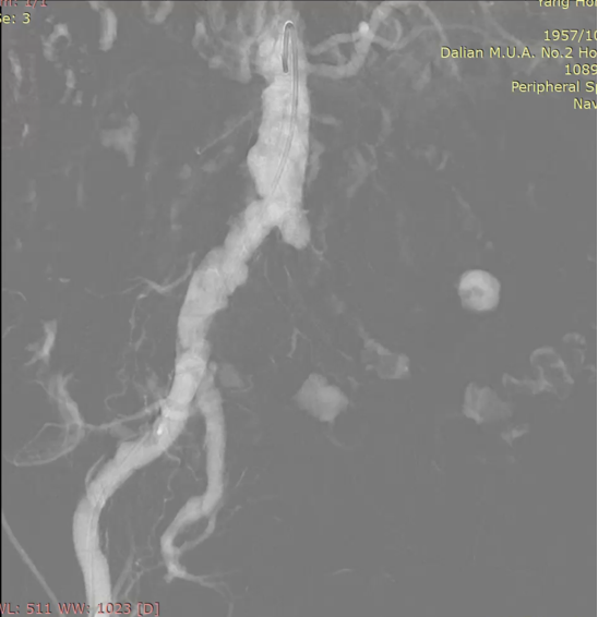 图为:穿刺后,导丝上行阻力,软针造影,髂动脉 极细