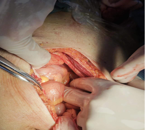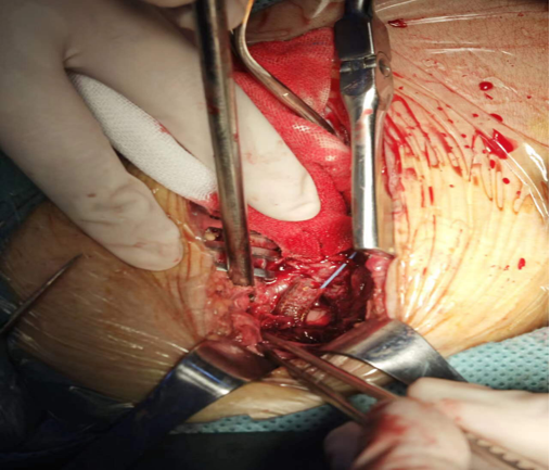 右侧腹直肌外侧切开皮肤,进入腹膜探查见髂总动脉起始端向远心端均见明显炎性改变,质脆,无法完成结扎阻断且覆膜支架与组织黏连无法取出