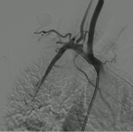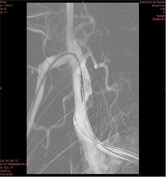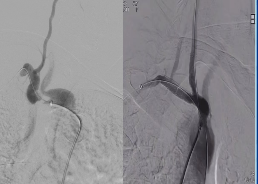 对于头臂干分叉处病变,需要同时对右锁骨下动脉和颈动脉植入支架(对吻支架)。术前CTA重建确定了最佳角度,术中直接采用该角度进行造影和支架释放,确保了双支架的精准定位,避免相互影响。