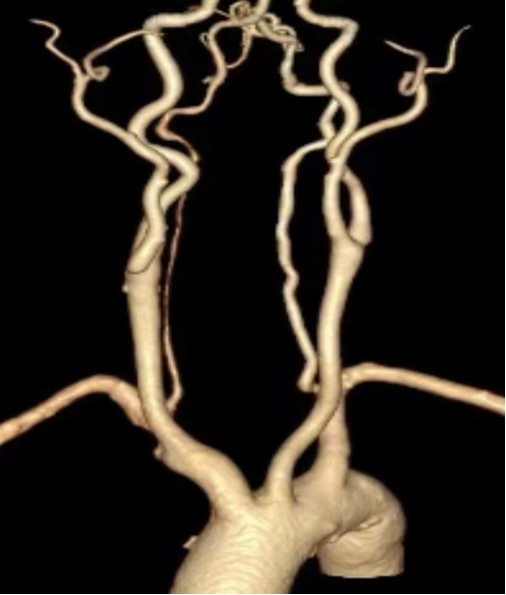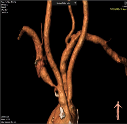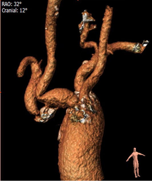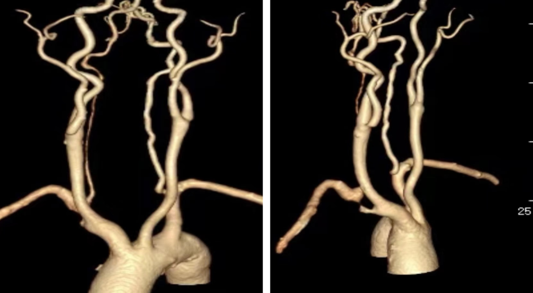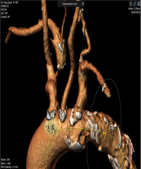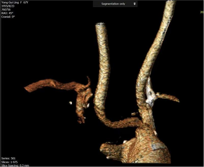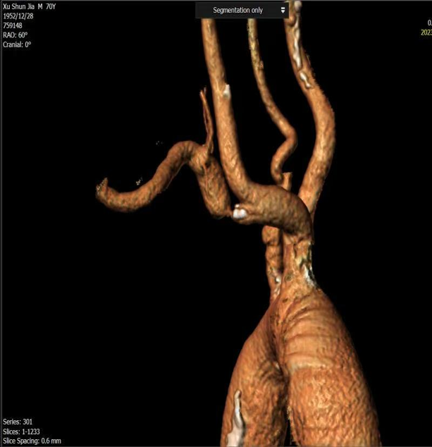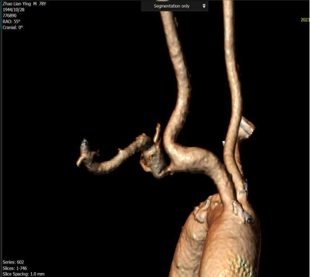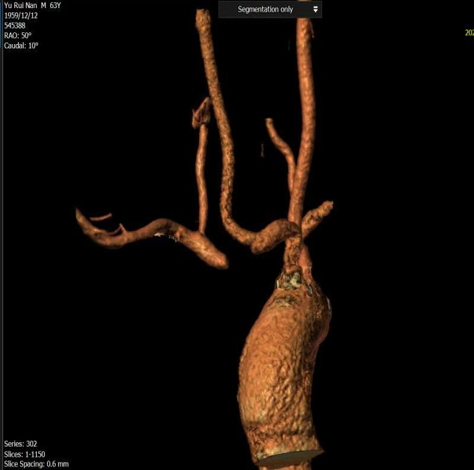 一致性高,指导性强:术前CTA三维重建模拟的投射角度与术中所需的最佳造影角度高度一致。该技术能精准显示头臂干、右锁骨下动脉及颈动脉分叉,显著减少术中造影次数,并有效指导导丝、导管的通过方向和支架的精准释放。