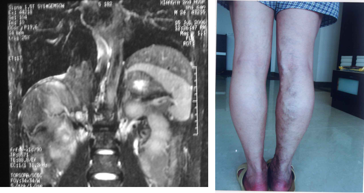 男,24岁,8岁时3楼跌下肝脏碎裂,三次手术止血将下腔静脉结扎,20岁后出现