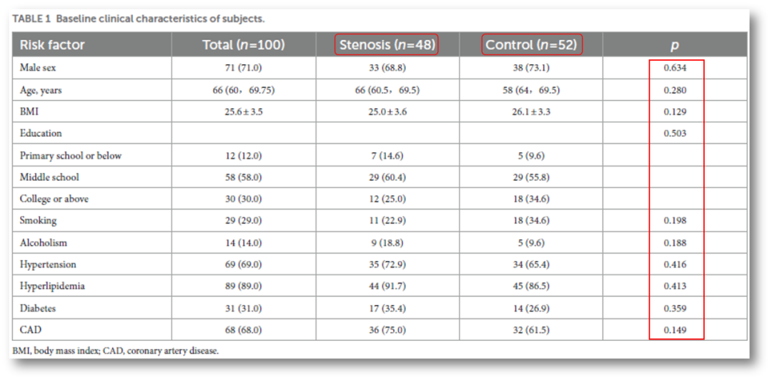 2. 年龄等人口学特征与无症状重度颈动脉狭窄组相匹配