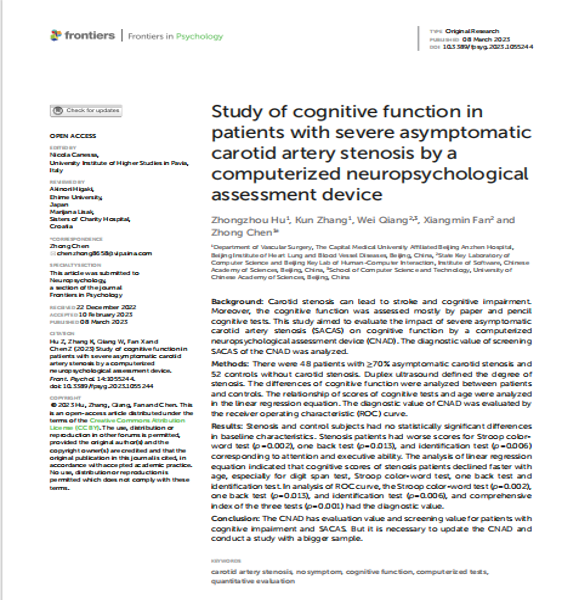 通过此系统工具评估颈动脉血运重建术是否能使无症状颈动脉重度狭窄患者的认知功能得以改善,为以后颈动脉狭窄血运重建术后认知功能的评估提供有效手段