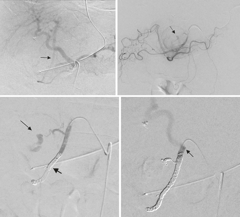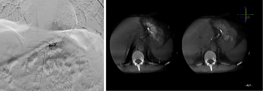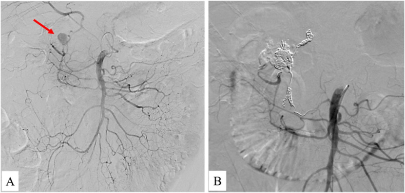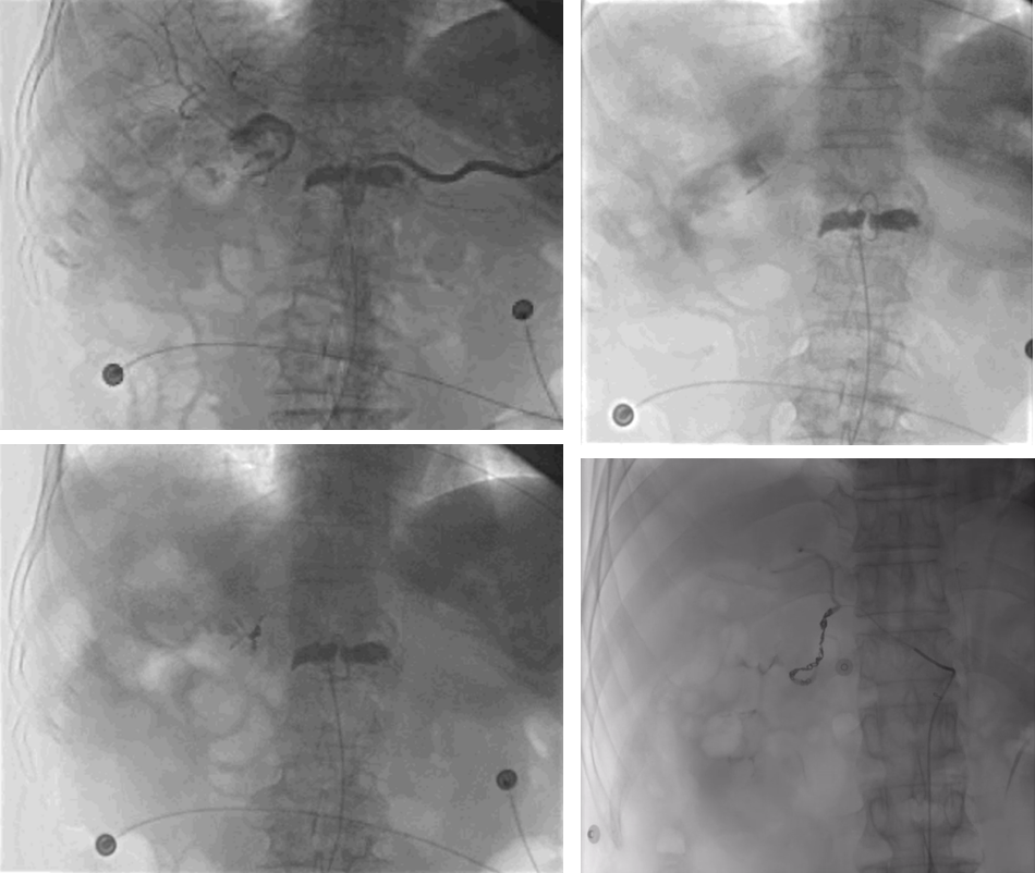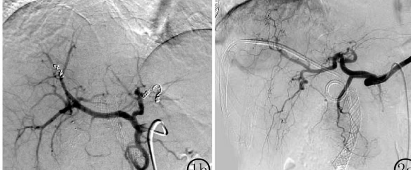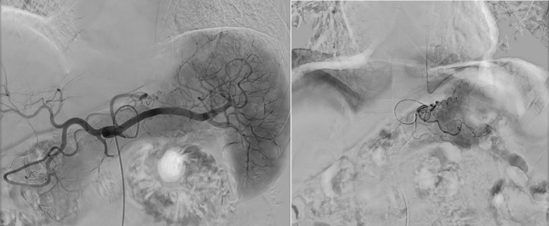 图:胆囊结石、胆总管结石术后 1 个月呕血及黑便;血管造影肝右动脉假性动脉瘤