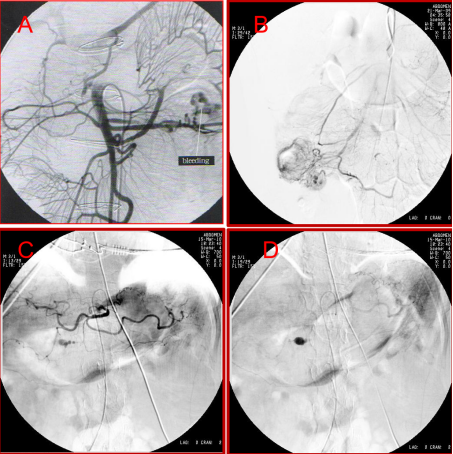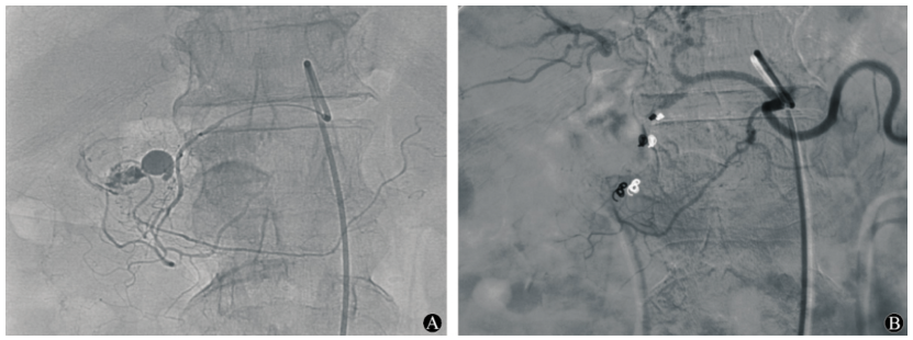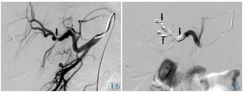 图:造影见胃十二指肠动脉近段动脉瘤,并可见造影剂溢出;弹簧圈栓塞后动脉瘤闭塞。