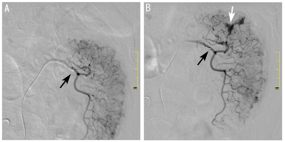 图:A:微导管进入左结肠动脉降支,造影,未见造影剂外溢;B:经微导管注射尿激酶12万U、肝素3000U、前列地尔10μg, 20min后行激发血管造影。出现造影剂外渗。