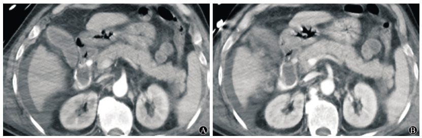 图:A:动脉期十二指肠球部、降段见结节状及线状高密度影;B:静脉期十二指肠内高密度影增多,强化程度稍减低。