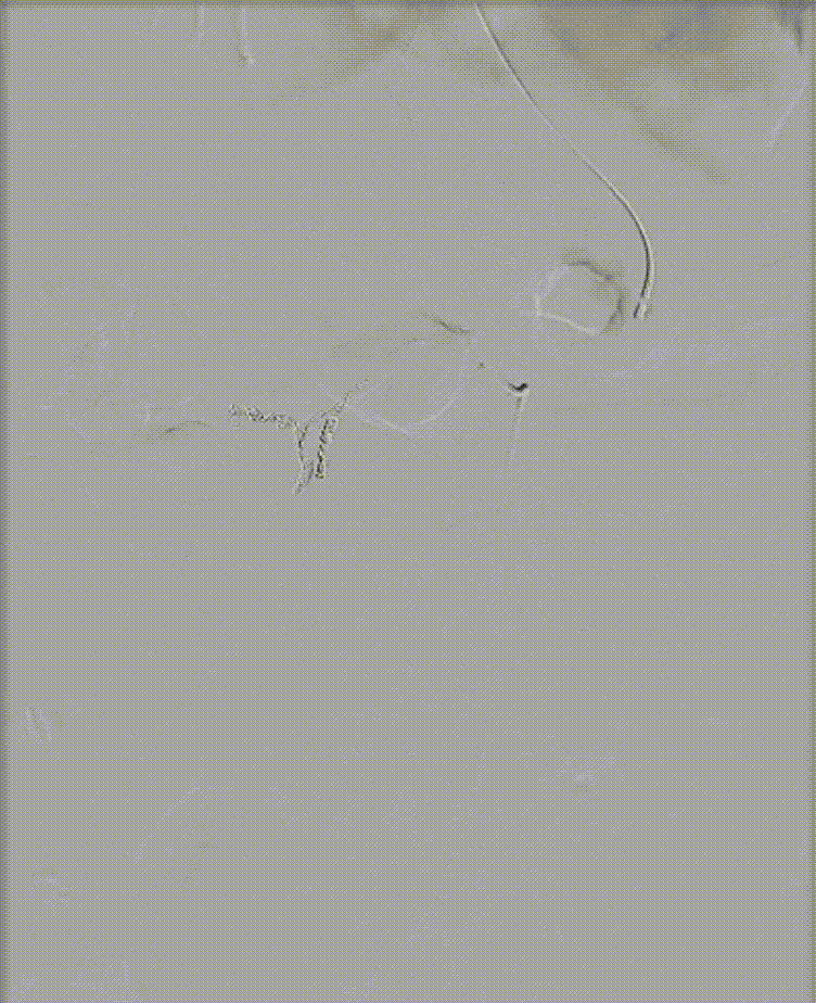 图:肝门胆管癌PTCD 、胆道支架术后 3 天,引流管反复引出血性胆汁;肝动脉造影未见异常,导丝交换撤出引流管后再次行肝动脉造影,对比剂经引流道外溢至腹腔。