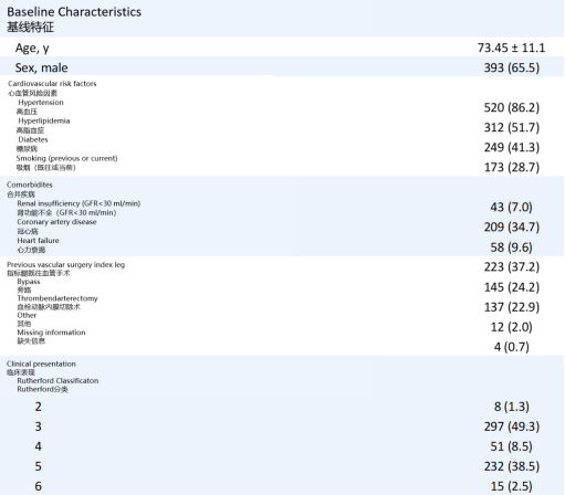 床分期:约一半(49.5%)为重症肢体缺血(CLTI)患者,另一半为严重跛行(50.5%)。