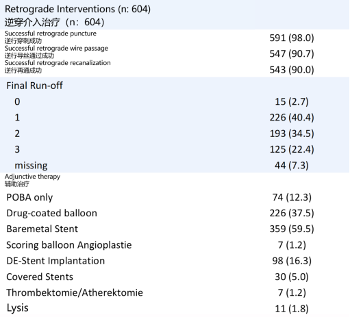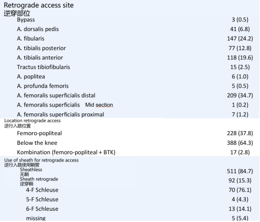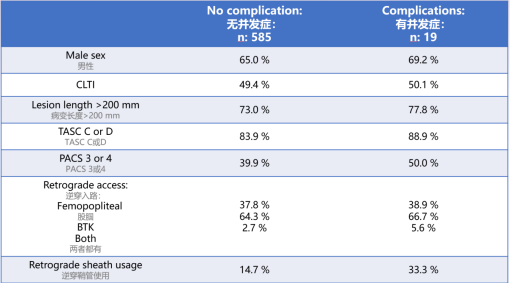 研究对象:604例连续的下肢动脉CTO病例。所有病例均先尝试顺行再通并宣告失败,随后转为逆行再通策略。