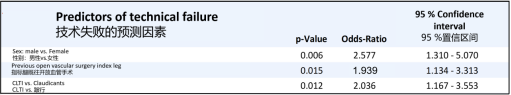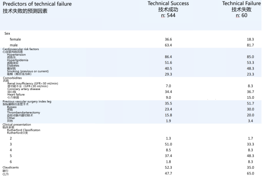 临床诊断为CLTI(OR 1.88):相比于跛行患者,CLTI患者往往意味着更晚期、更弥漫的血管病变,侧支循环更差,远端流出道条件更劣,这些都增加了逆向开通的难度。