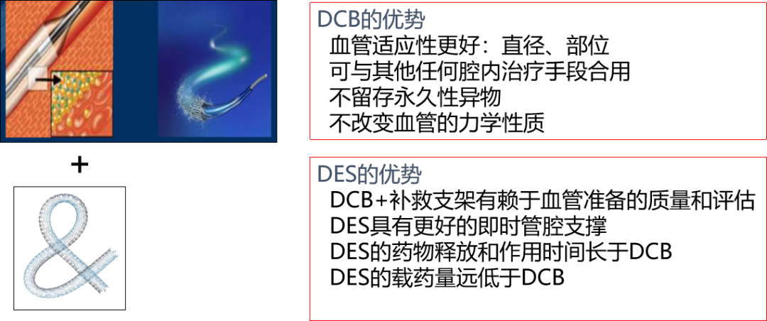 DCB的显著优势在于不留异物,可与各类强力治疗手段联合使用;DES的优势则体现在对血管准备质量和评估的依赖度较低,具备更优的管腔支撑能力,药物释放时间长于DCB,且载药量远低于DCB。