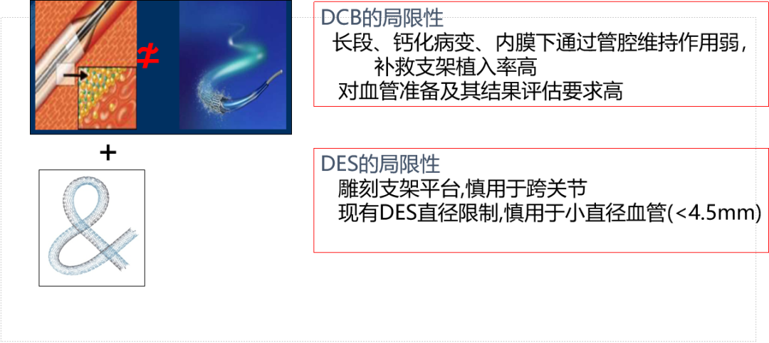 DCB作为球囊类器具,单独用于复杂病变时管腔维持作用不足,病变越复杂,补救支架率越高,且对血管评估的精准度要求极高;DES目前多以雕刻支架为平台,跨关节使用受限,国内市场现有DES最小直径为6mm,对小血管病变适用性不足。