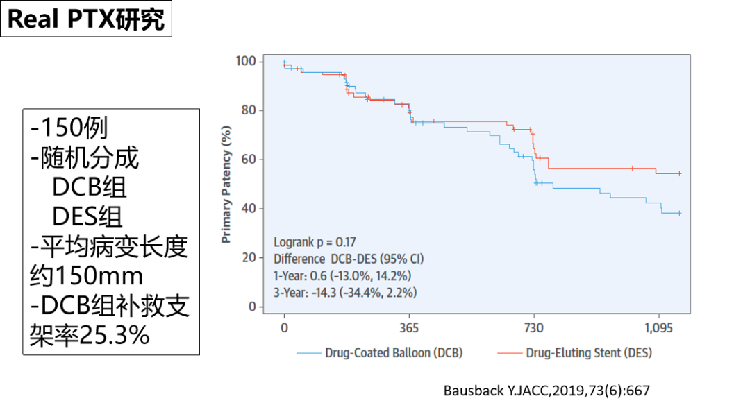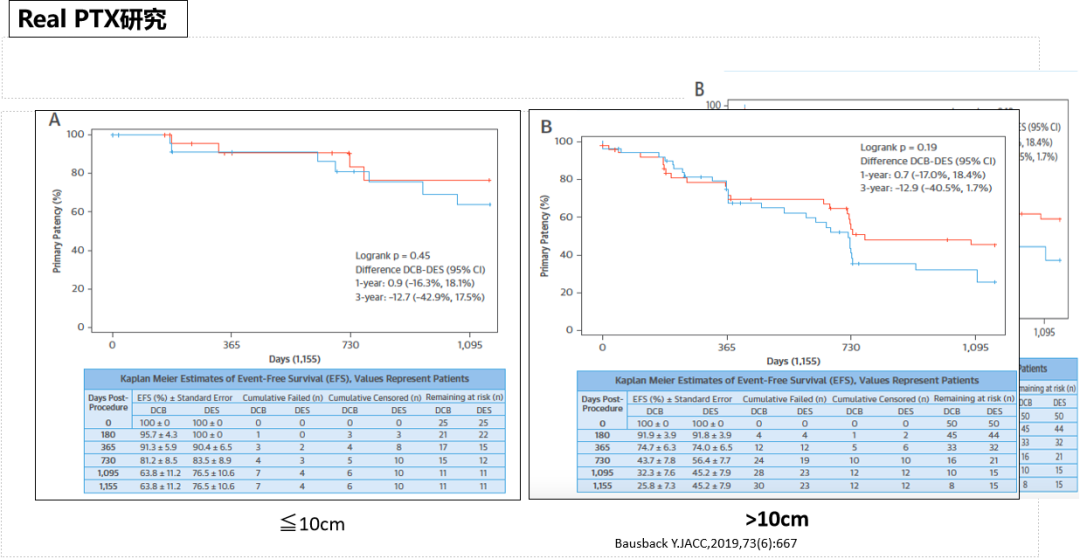 该研究为DES与DCB+补救支架的头对头随机对照研究,结果显示:术后1年两者疗效基本重叠,但2-3年后疗效逐渐分离,DES的长期通畅效果更优,尤其在病变长度>10cm的复杂病变中,这一趋势更为明显。