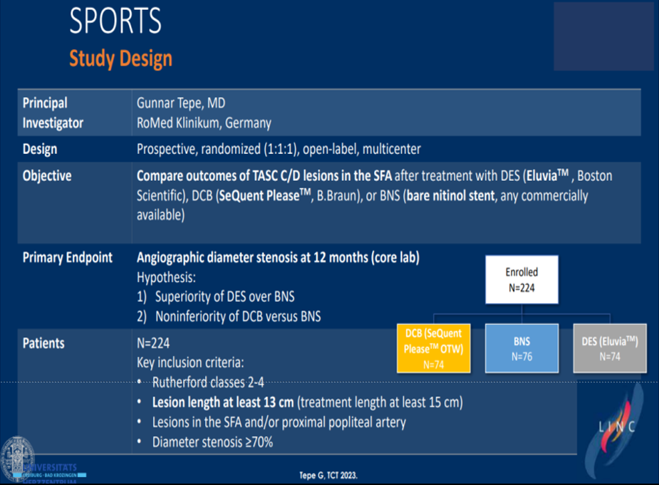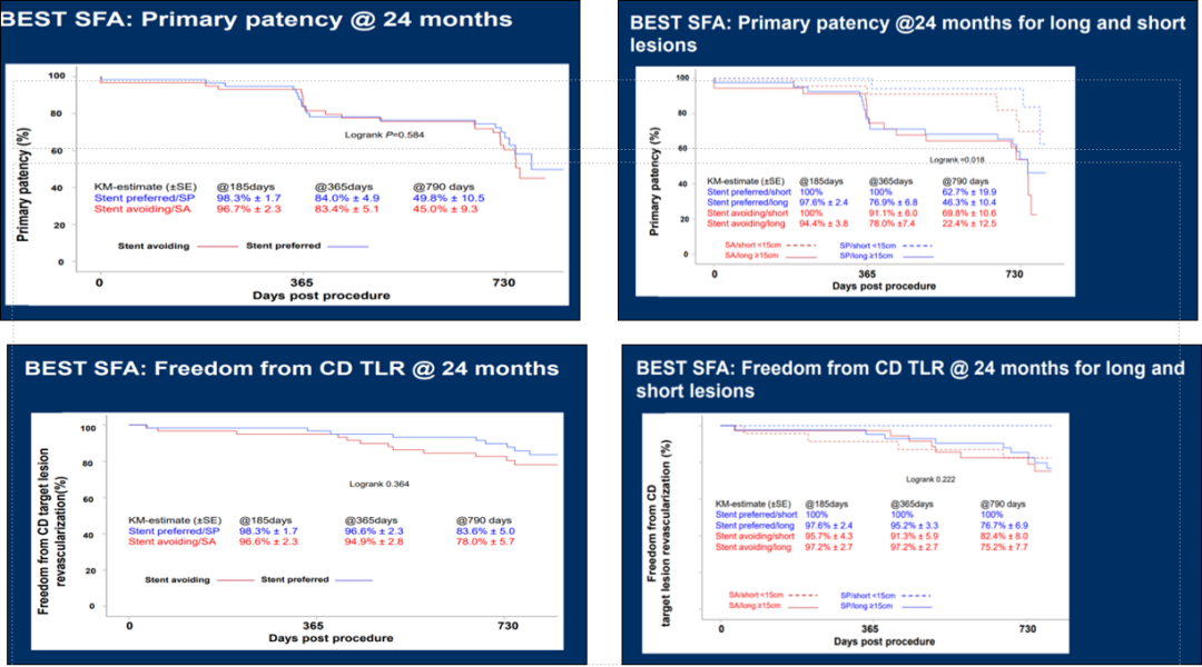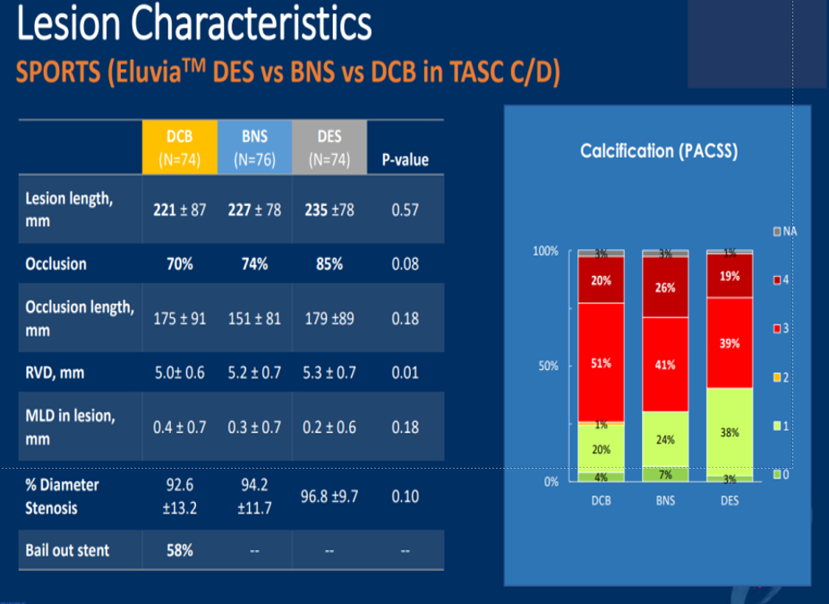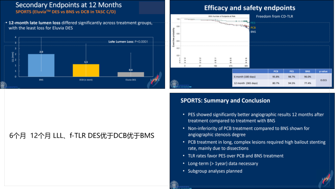 这是一项前瞻性多中心研究,针对TASC CD级病变对比了Eluvia DES、金属裸支架与DCB的疗效。结果表明,6个月和12个月的管腔丢失情况中,Eluvia DES效果最优,DCB次之,金属裸支架最差,提示复杂病变中DES具有显著优势。